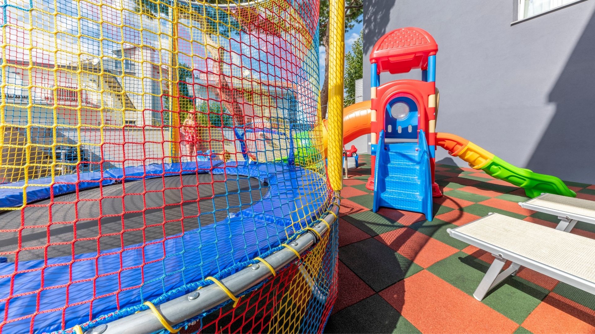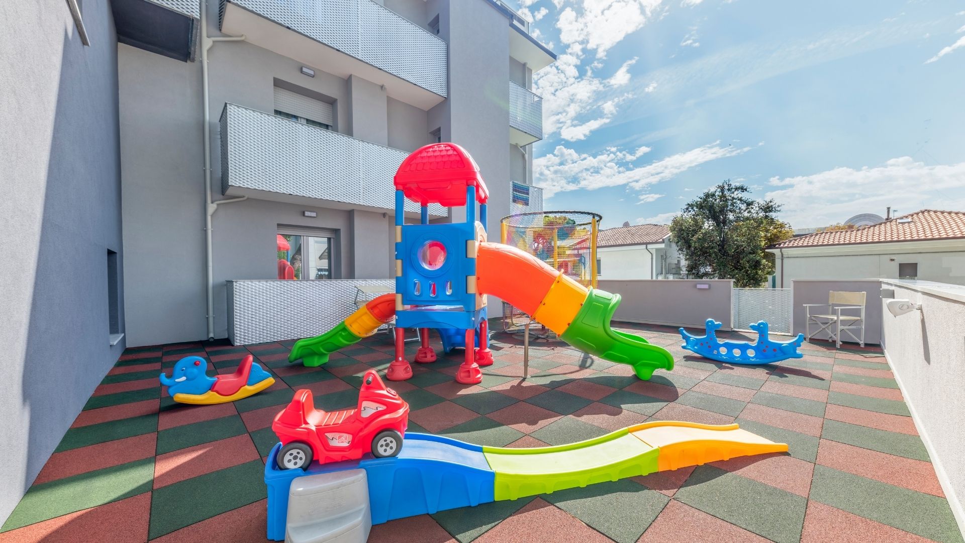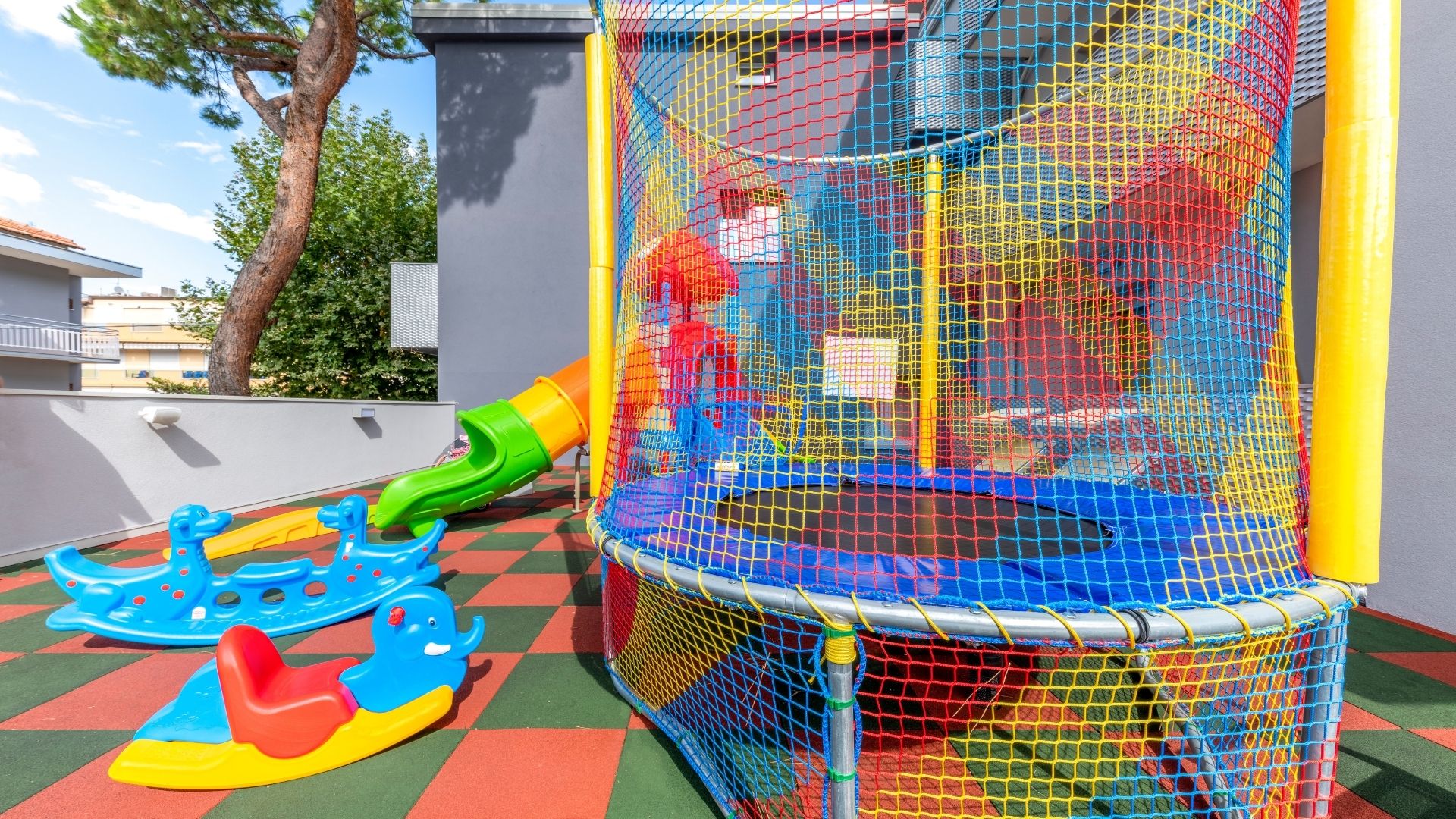 • Libertà di giocare: un ambiente protetto dove i bimbi possono socializzare, fare nuove amicizie e dare sfogo alla loro energia tra scivoli e casette colorate.