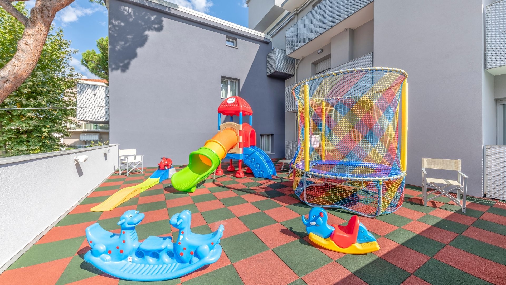 • Il cuore del Residence: l’area giochi è pensata per essere il punto d’incontro pomeridiano, dove ogni giorno nasce un’avventura diversa.