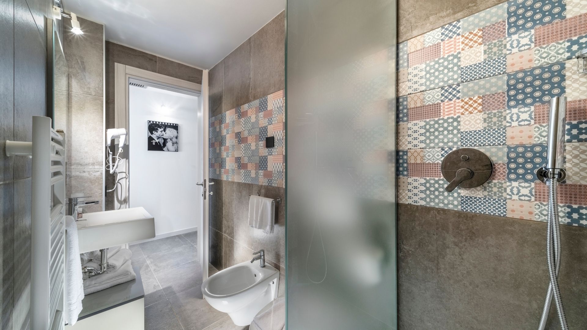• Dettagli Pratici: cassaforte elettronica, bagno moderno con box doccia e asciugacapelli professionale.